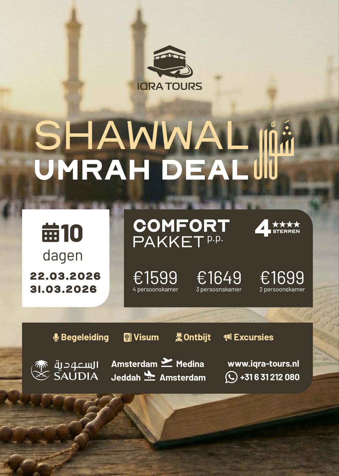 SHAWWAL UMRAH DEAL 2026 22-03-2026 T/M 31-03-2026 Vanaf p.p. €1599 Madinah & Mekka Vertrek: 22 Maart ’26 Retour: 31 Maart ’26 Vluchten: Saudia Kamer: 2, 3 of 4 persoonskamer Maaltijden: Ontbijt Transport & Excursies Madinah Nu boeken Ik heb een vraag